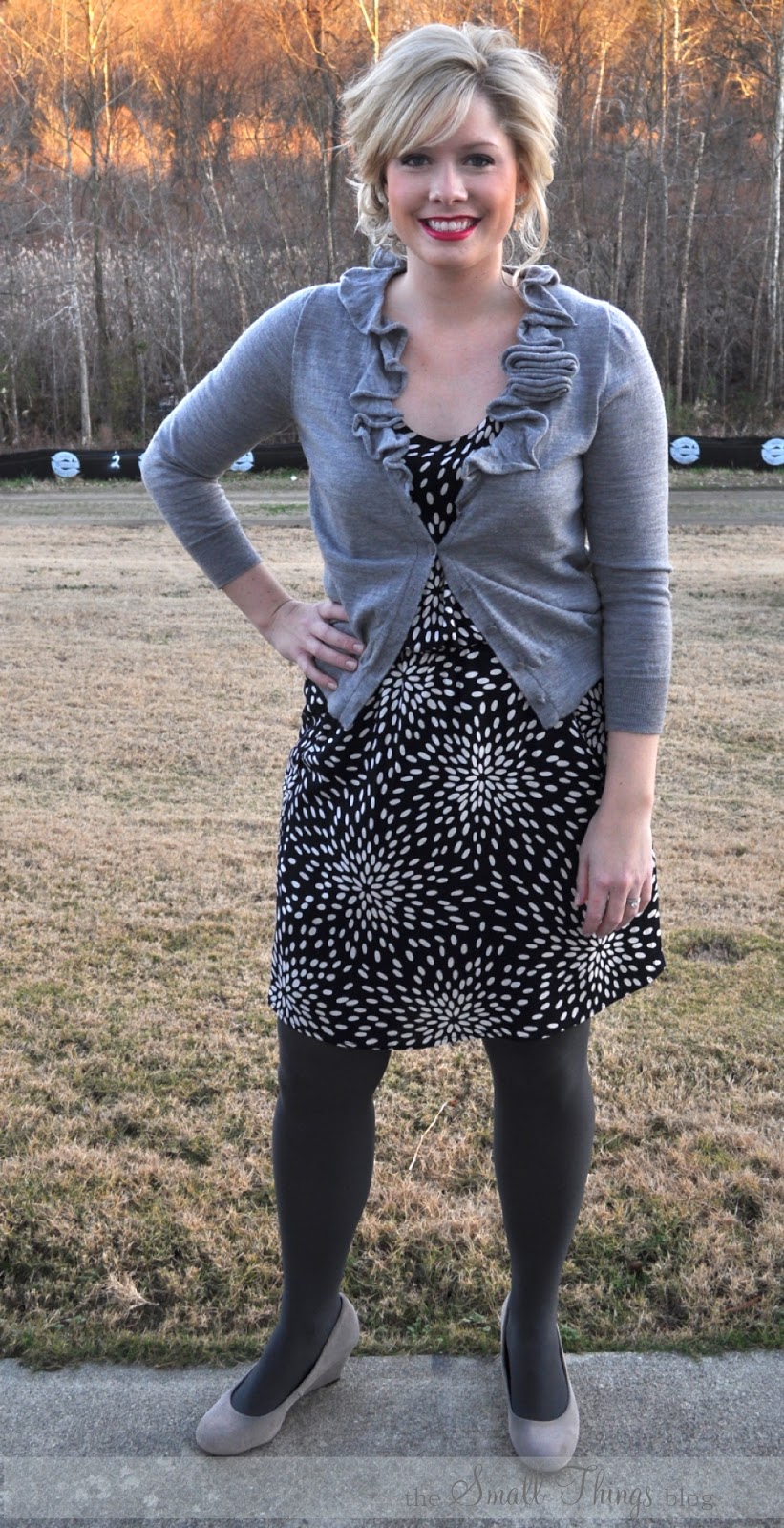 Sweater: J.Crew Outlet, Dress: Francesca’s, Tights: H&M, Shoes: Target, Jewelry: Elisabeth Ashlie
