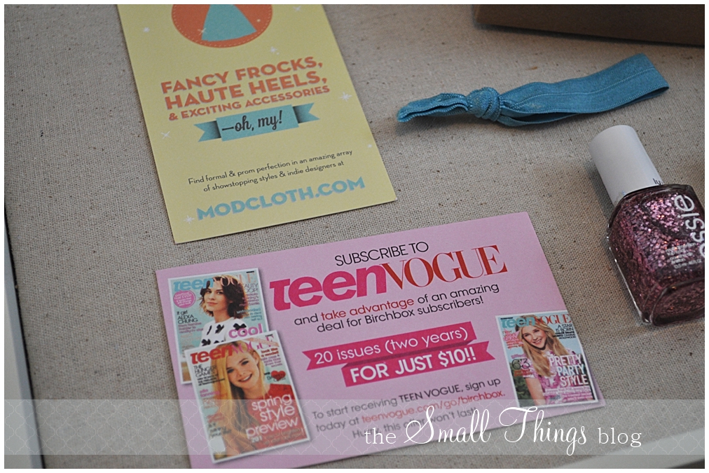 I wouldn’t say I LOVE my first Birchbox, but I am excited to use the products they sent. I chose the Teen Vogue as well but got a regular box. But the hair tie is totally a cute idea.
