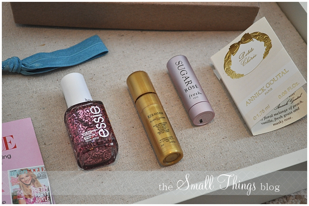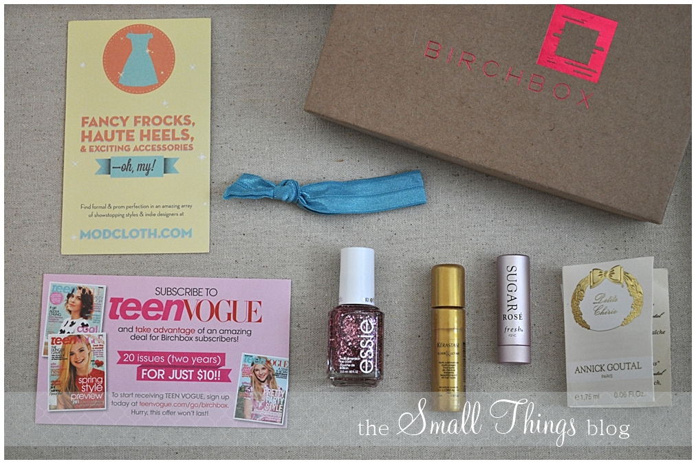 This was my first Birchbox and I loved everything in it! I got the same polish, a pink hair ribbon, and the Kerastase. I also got the Tarte lip stain in lucky that I love, and my perfume sample is Kate Spade Twirl which is quickly becoming a new fave. I can’t wait til the 10th of every month now!