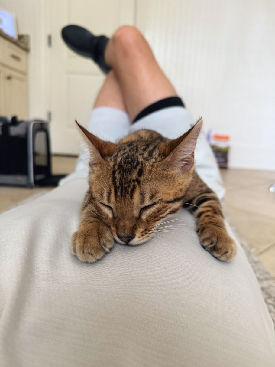 Bengals are smart, playful, energetic, and can sometimes act a little more like a small dog than a cat. Benji was certainly a super energetic and playful kitten when we first brought him home (it kind of overwhelmed me to be honest!), but he has mellowed out a bit. He’s been home for about 4 months, and he is 7 months old.
