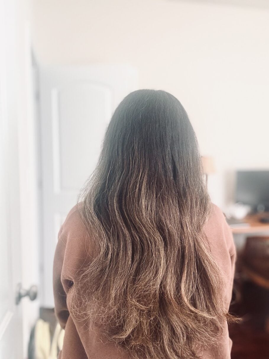 I would recommend cutting about 3 to 4 inches off the bottom at the least, and make sure you’re using a great flat iron when you smooth it out! I love that you only have to style it one time a week, which is probably why it’s so long and healthy, but it looks like the ends need a little love.